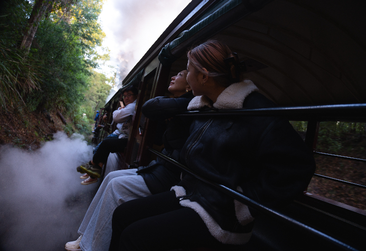 昔ながらのスタイルで窓枠に腰掛け、風を感じながら走る体験は、子どもから大人まで大人気。出発から数分で登場する象徴的なトレッスル橋もお見逃しなく!カメラの準備を忘れずに。