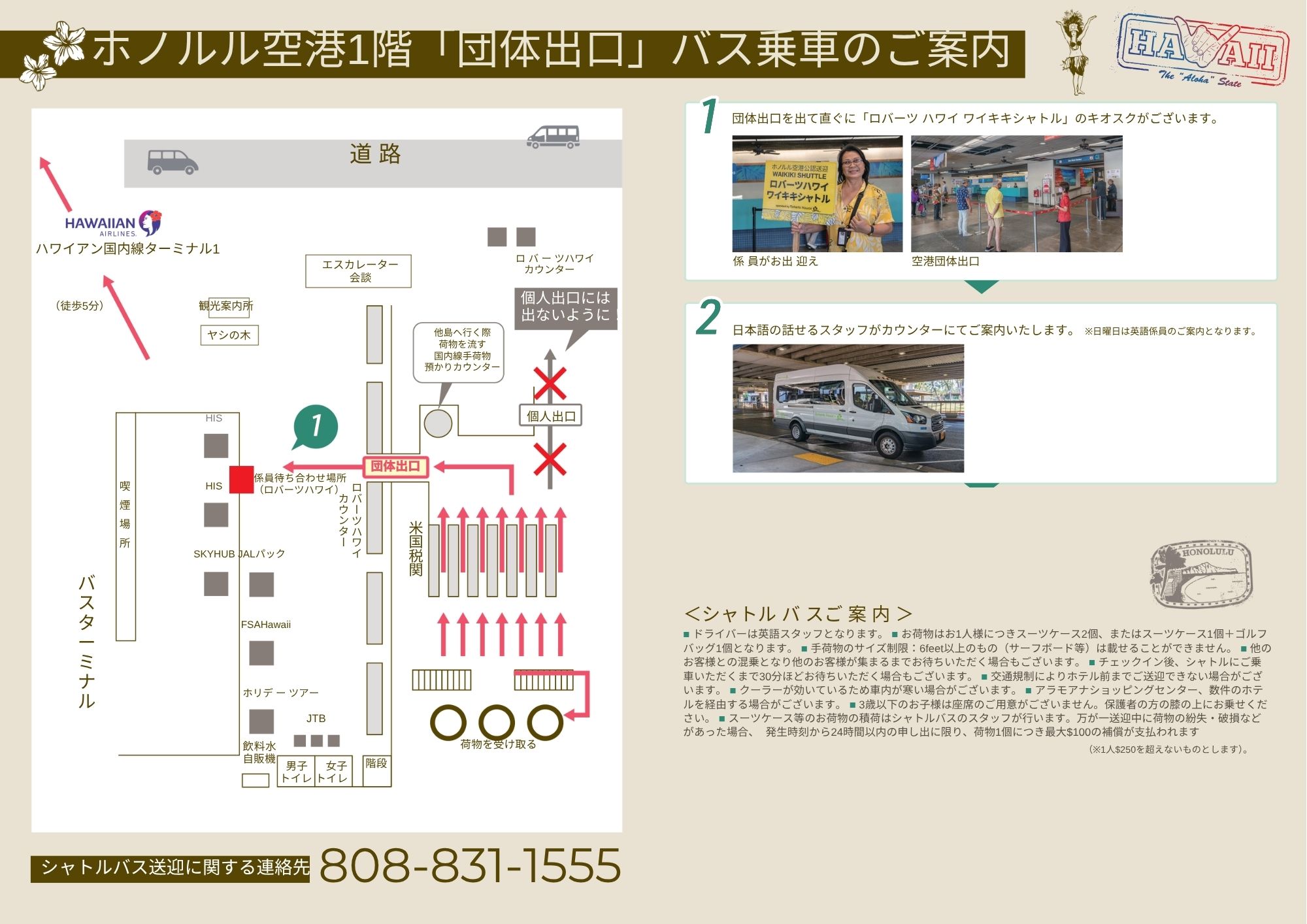 国内線利用時:手荷物受取場内のロバーツハワイ(Roberts Hawaii)カウンターまでお越しいただき、スタッフにお名前をお伝えください。なお、午後5時以降はカウンターにスタッフがいない場合があります。その場合は、出口を出て右手のバス乗り場までお越しいただき、ロバーツハワイのサインがあるところでお待ちください。