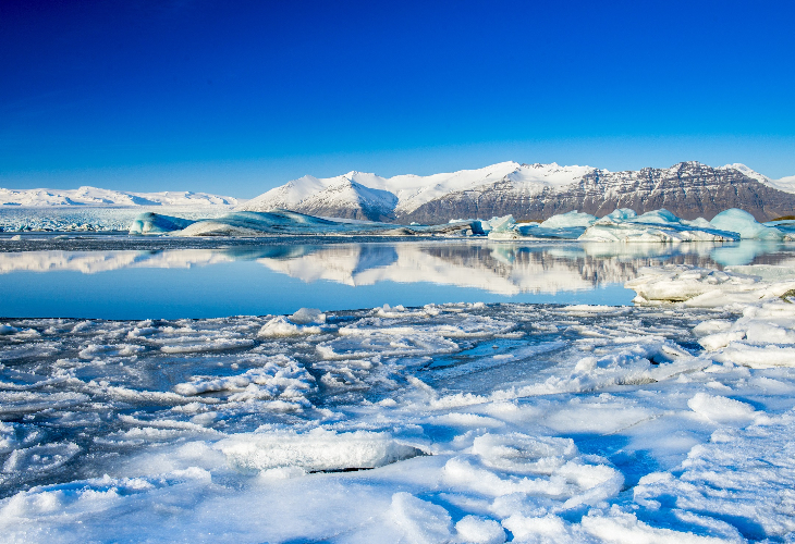大小様々な氷が湖面に浮かぶヨークルサルロン氷河湖をご見学ください。