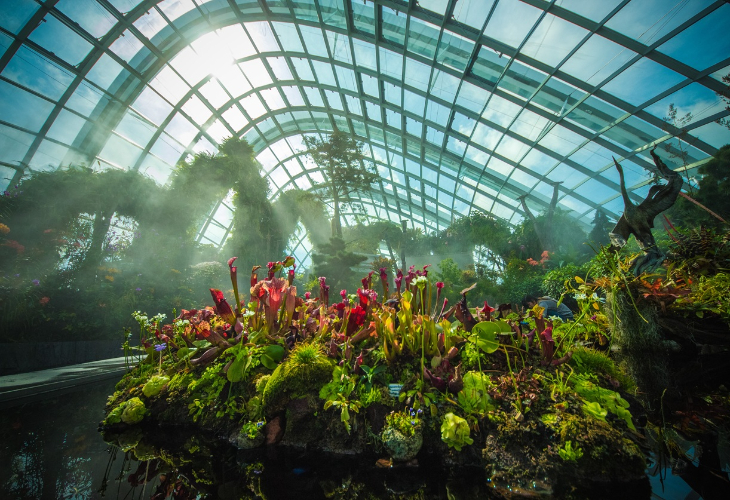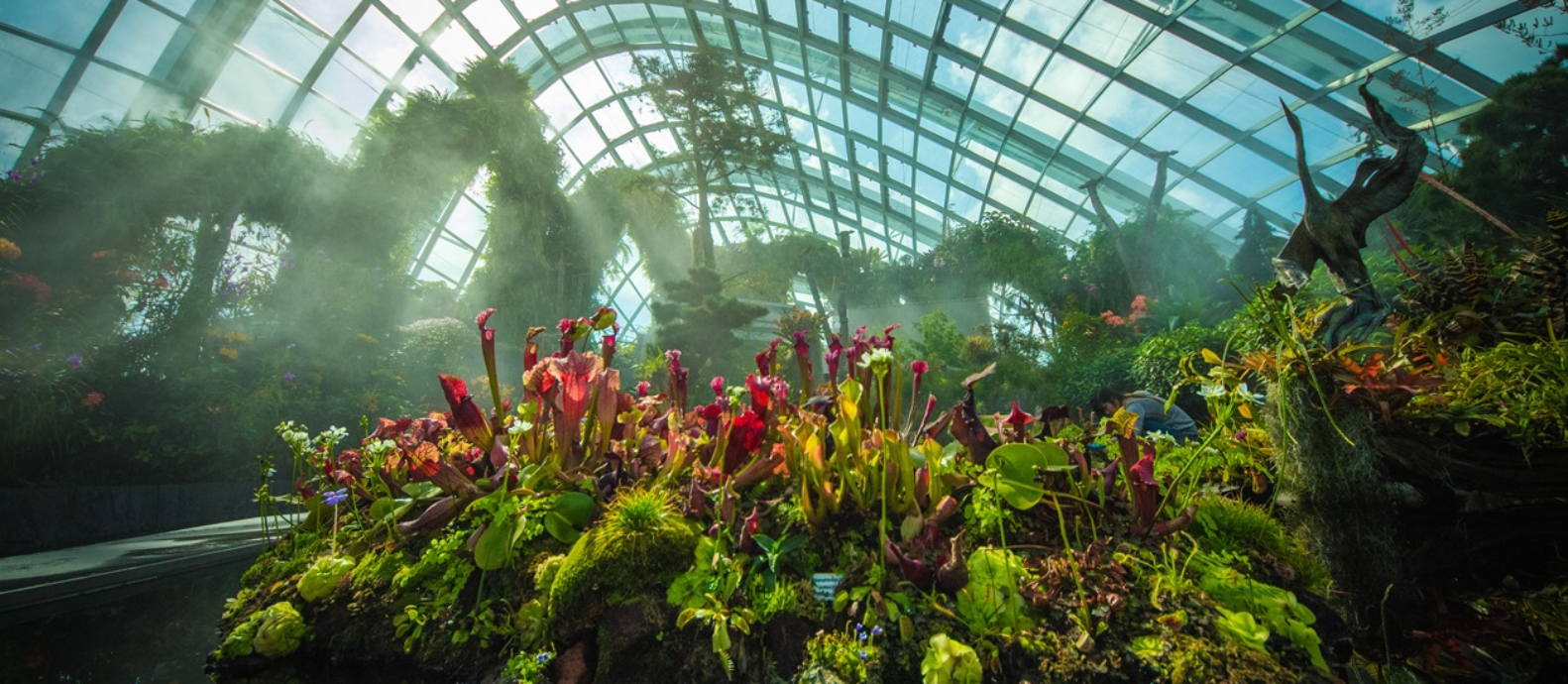 壮大な山の景色と72,000種の植物を楽しめ、屋内で世界一高い30mの滝も間近に見られます。