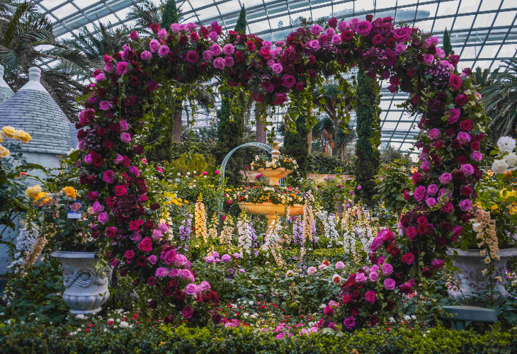 世界最大のガラス温室「フラワードーム」では、5大陸の花々をテーマにした9つの庭園を鑑賞できます。