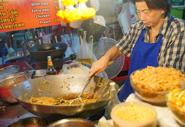 チャイナタウンの中心でパッタイを片手に乾杯。その後は、活気あふれるナイトマーケットを散策し、タイと中国の食文化の融合を堪能.