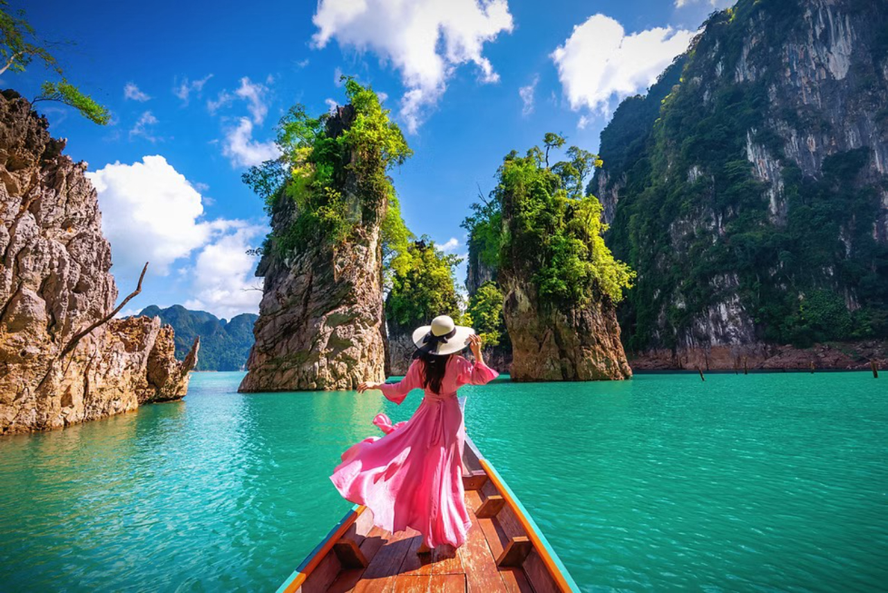 ・チョーラン湖へ出発。桟橋に到着後、ロングテールボートに乗船し、エメラルド色に輝くチョーラン湖をクルーズ