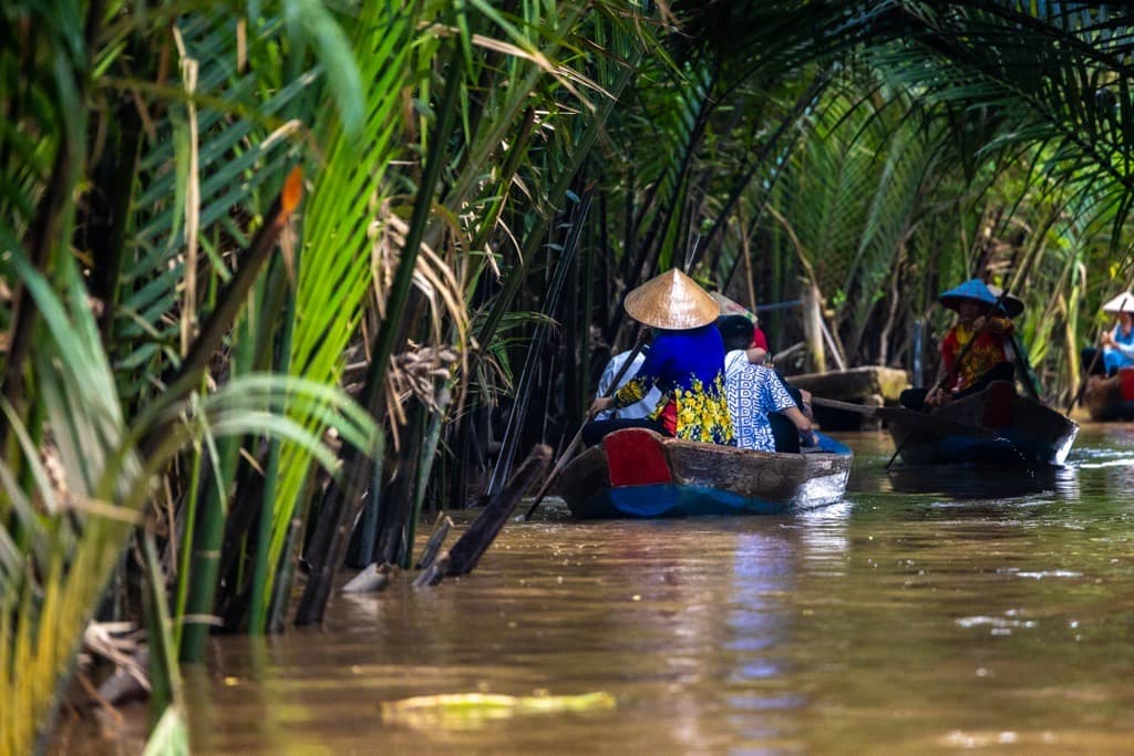メコン川クルーズツアーでも最も定番・人気の場面。小舟に乗ってココヤシが茂る水路を川下りします。